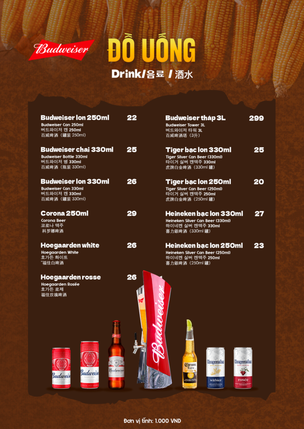 Đồ uống đầy đủ: bia, nước ngọt, rượu, cocktail nhẹ
