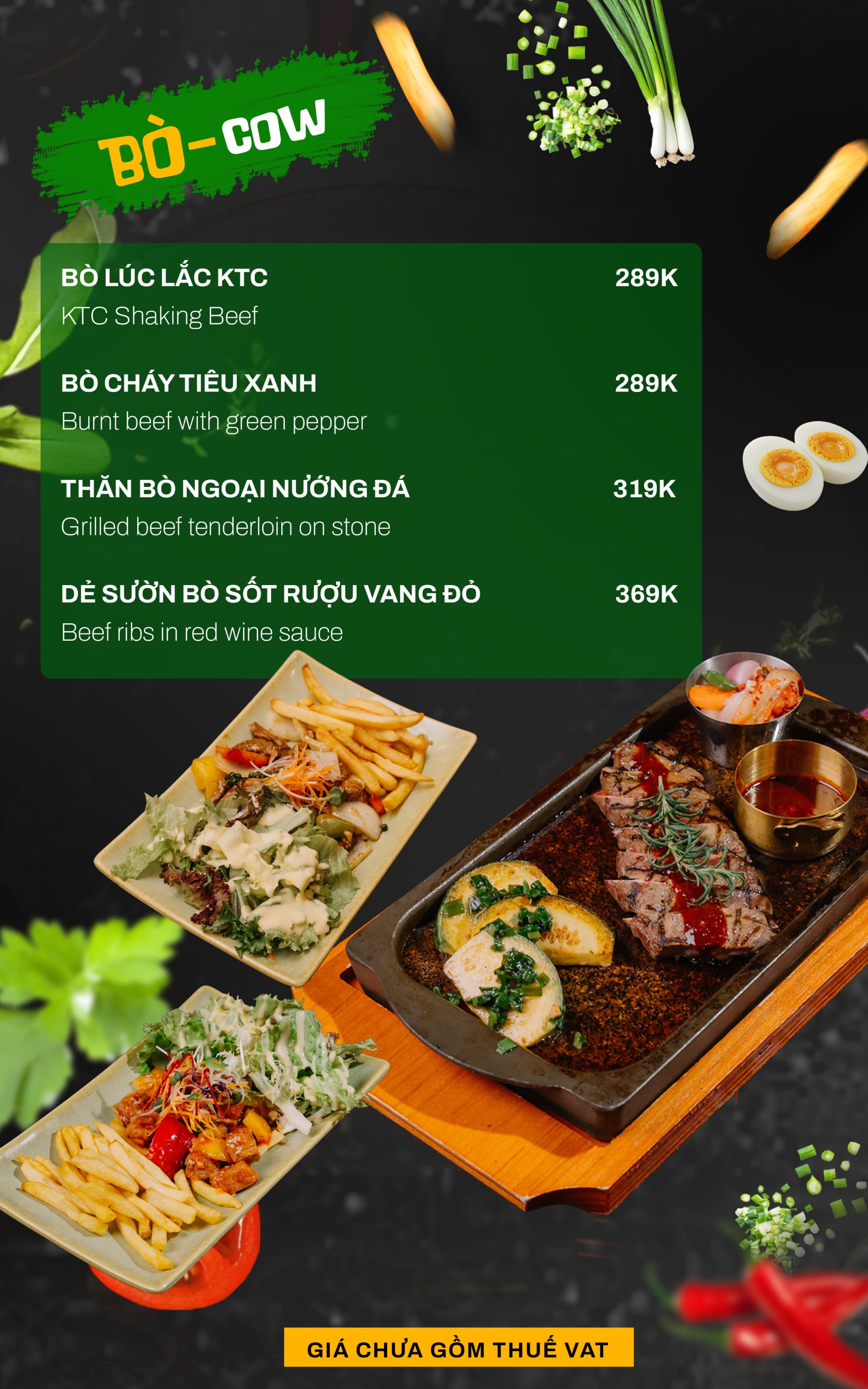 Thực đơn phong phú, đa dạng phong cách ẩm thực, phục vụ cả món Việt và món quốc tế.