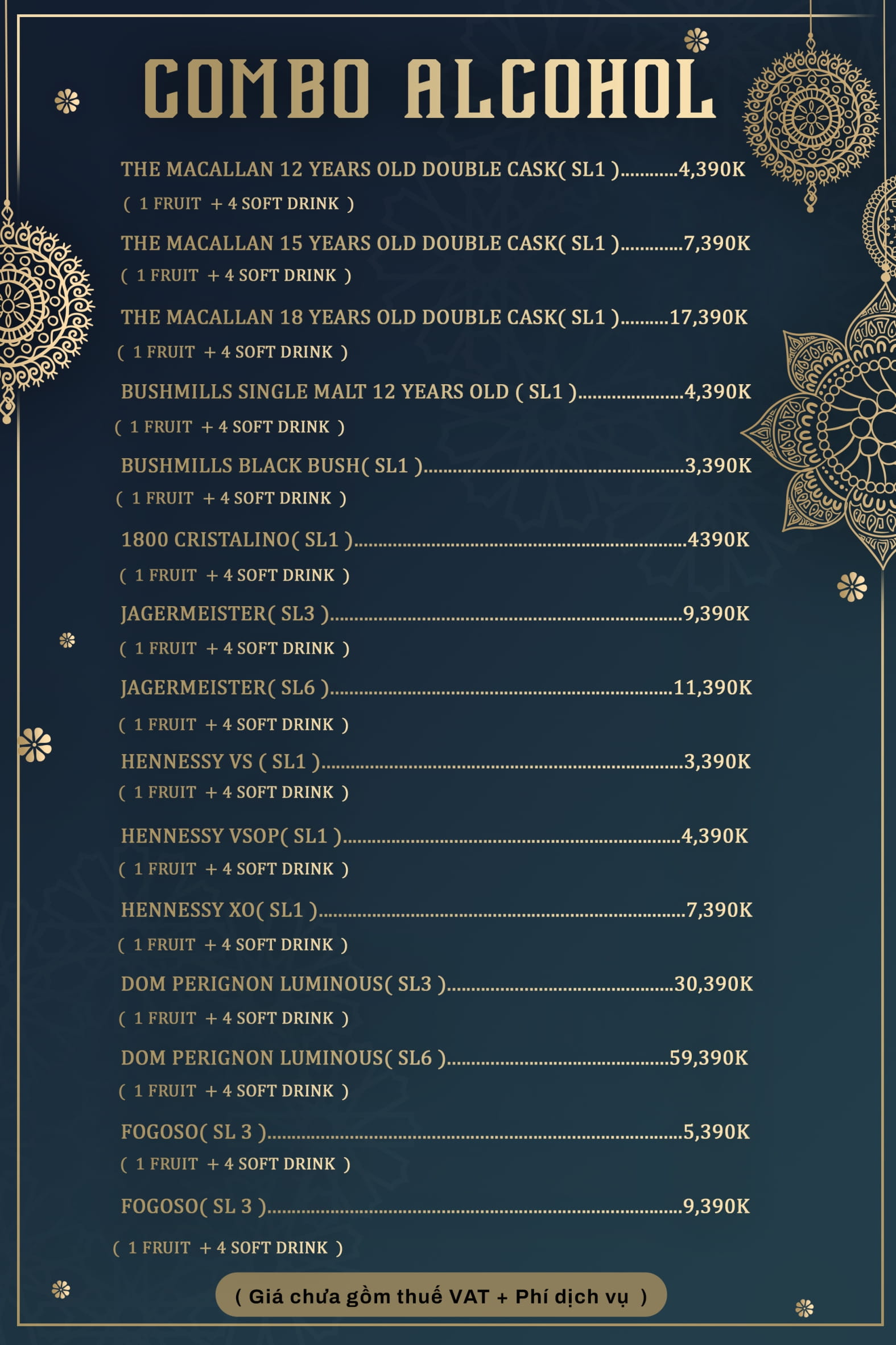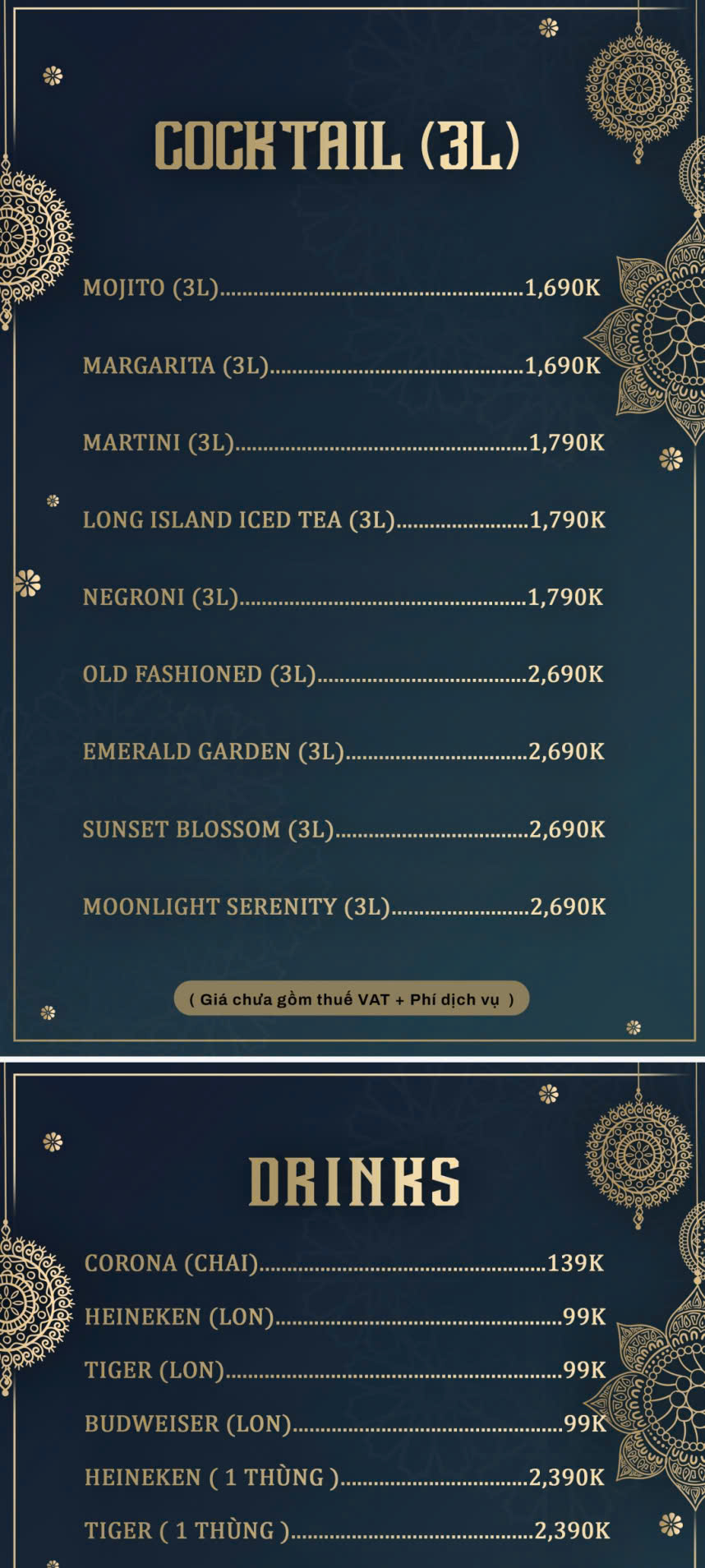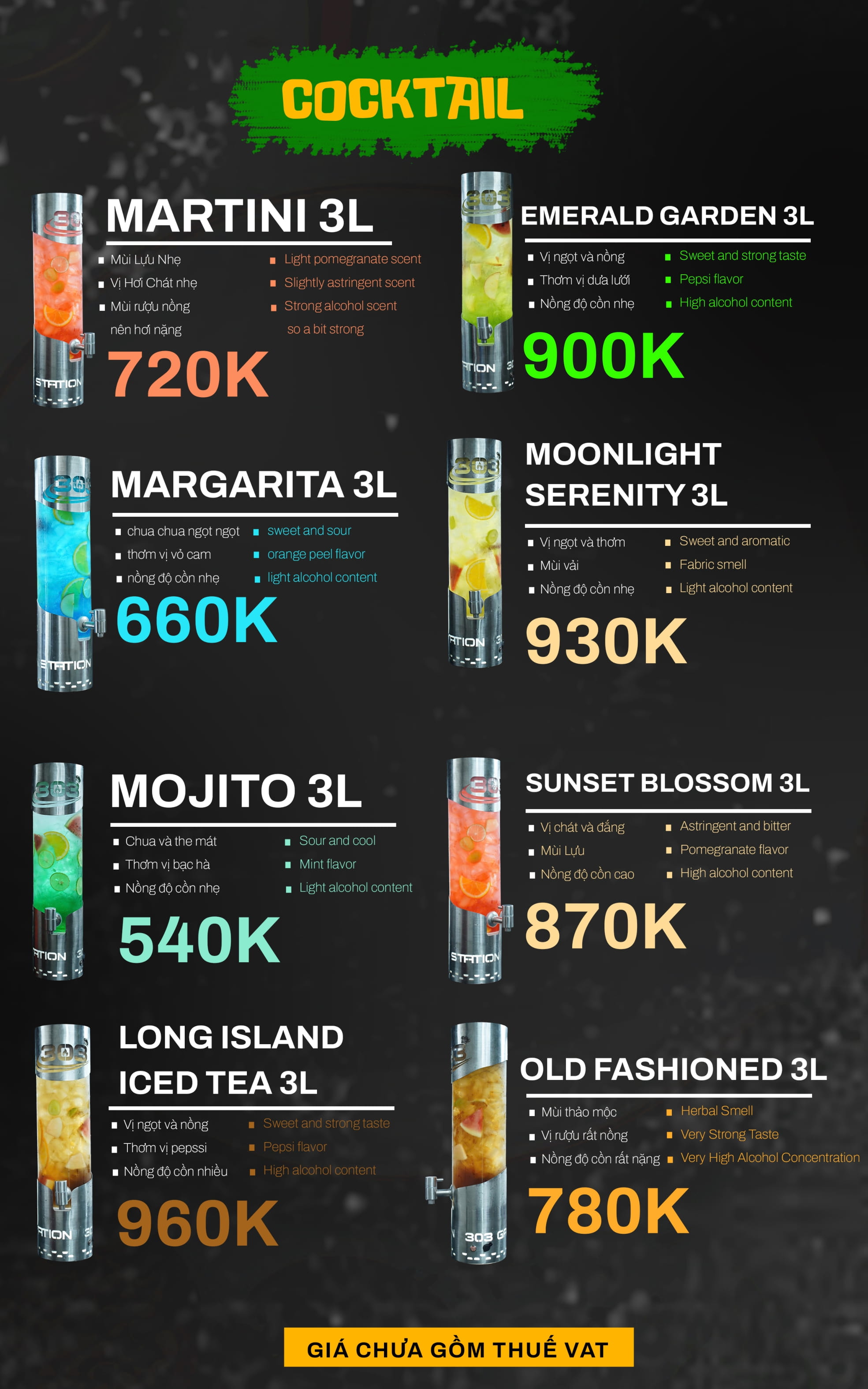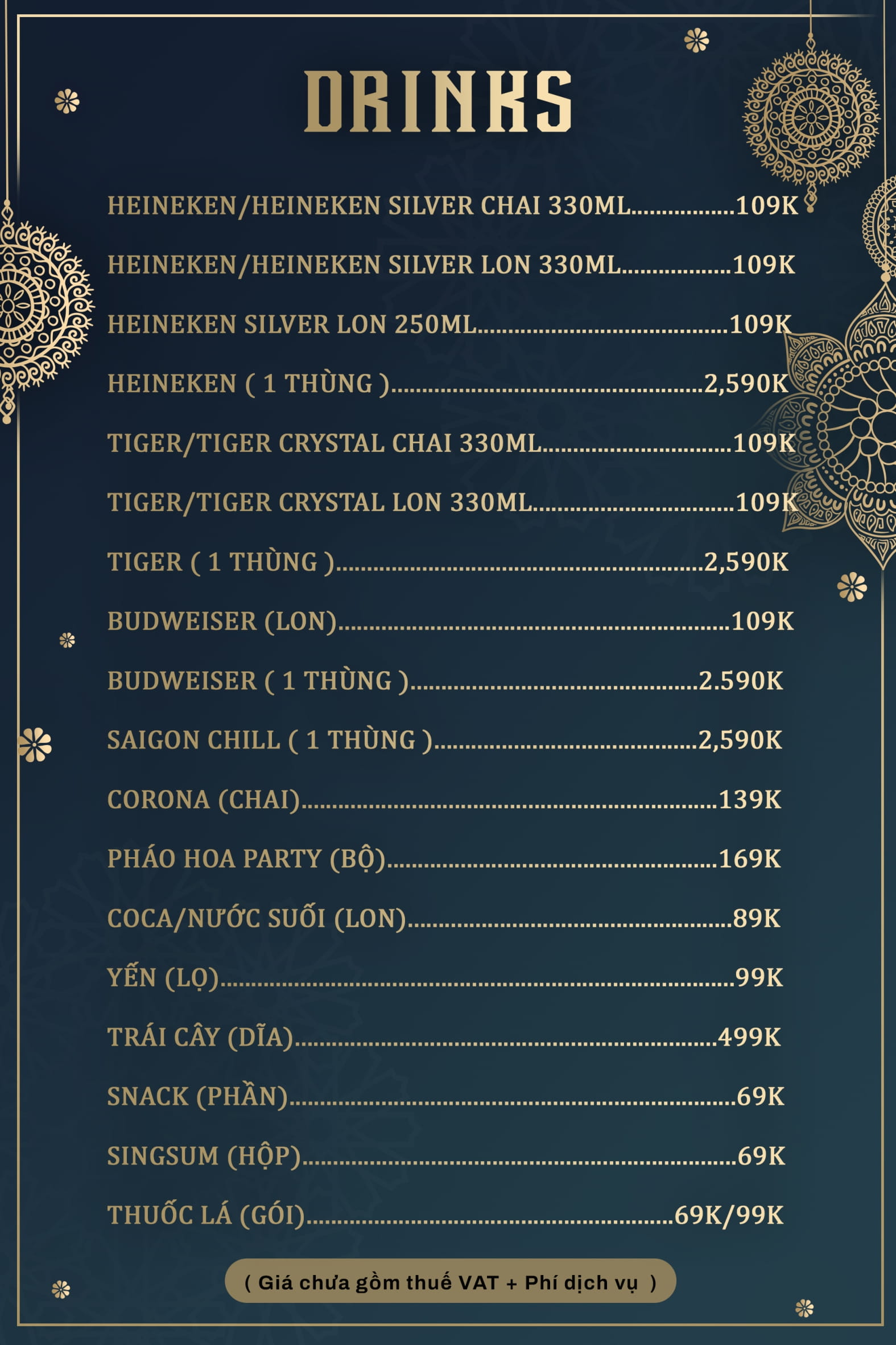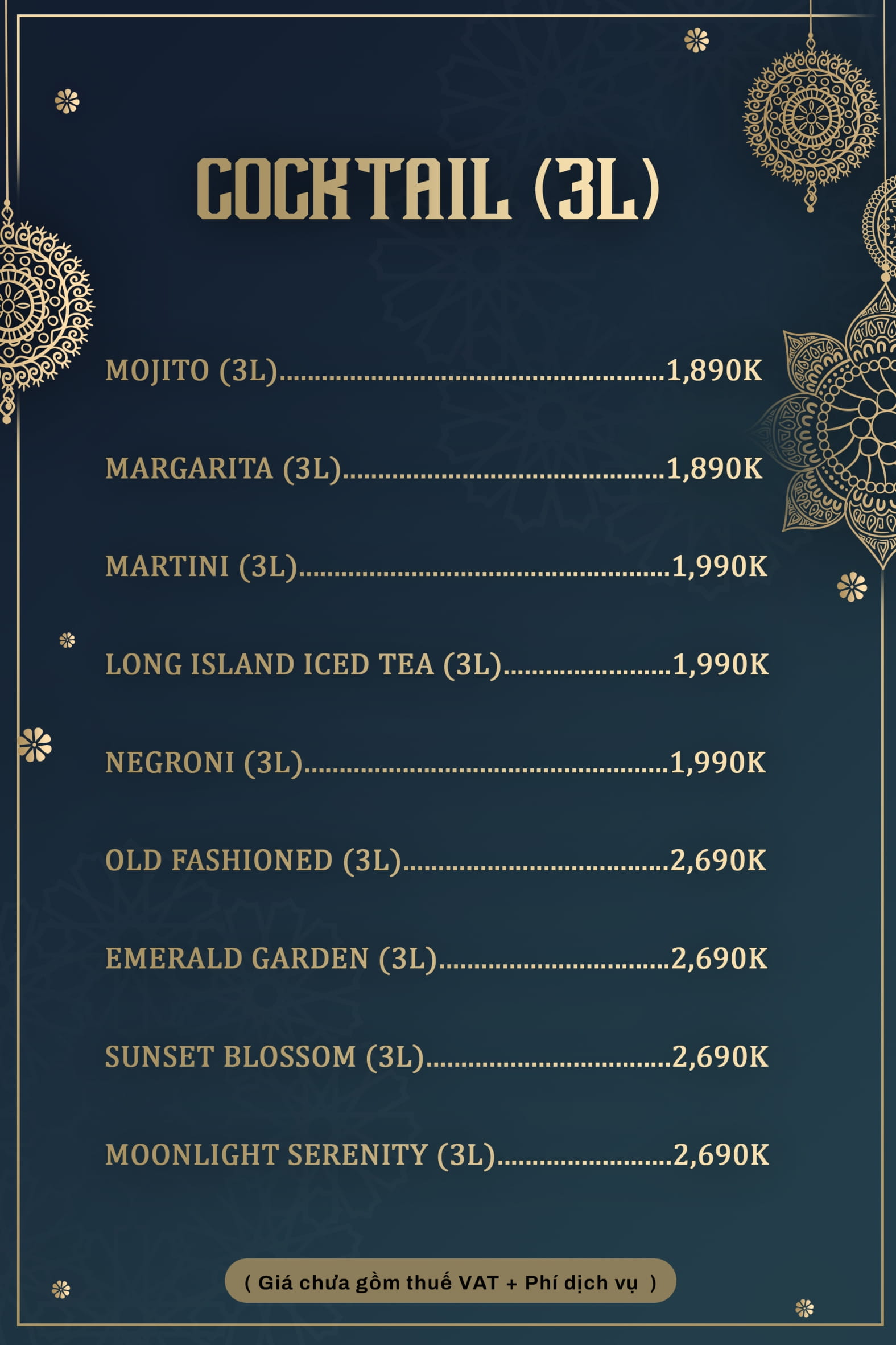 Menu bia, cocktail, mocktail phong phú, được pha chế bởi bartender chuyên nghiệp.
