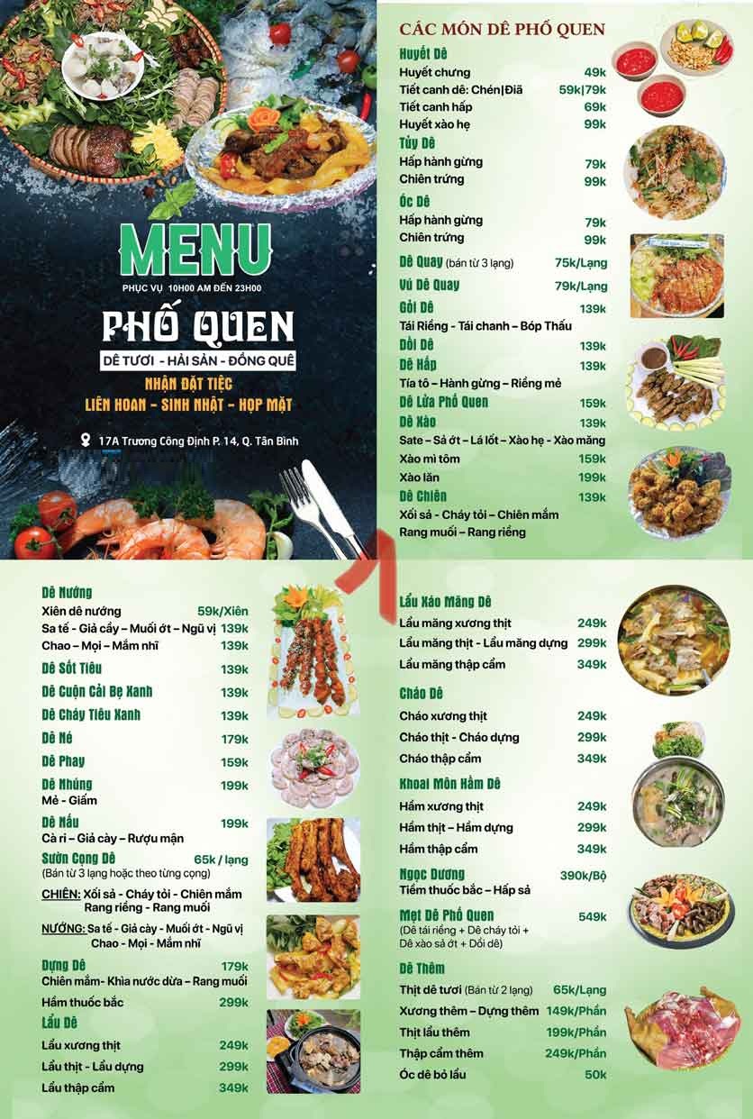 Tọa lạc tại 17A Trương Công Định, Phường 14, Quận Tân Bình, TP. Hồ Chí Minh, Dê Quay Phố Quen là điểm đến lý tưởng nếu bạn muốn thưởng thức món dê quay thơm ngon, hải sản tươi sống cùng các món đồng quê đậm đà bản sắc Việt. Với không gian rộng rãi, thoáng mát và sức chứa lên đến ≈ 300 khách, nhà hàng phù hợp cho mọi dịp: từ bữa ăn gia đình, tụ tập bạn bè, tổ chức sinh nhật, đến tiệc công ty.