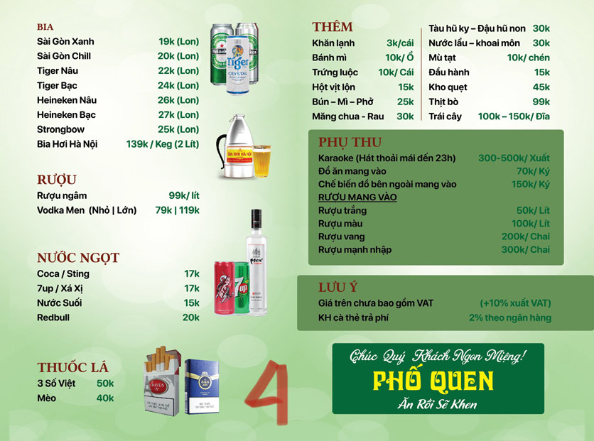 Giá menu chưa gồm VAT; có hóa đơn VAT (~8-10%) nếu cần.