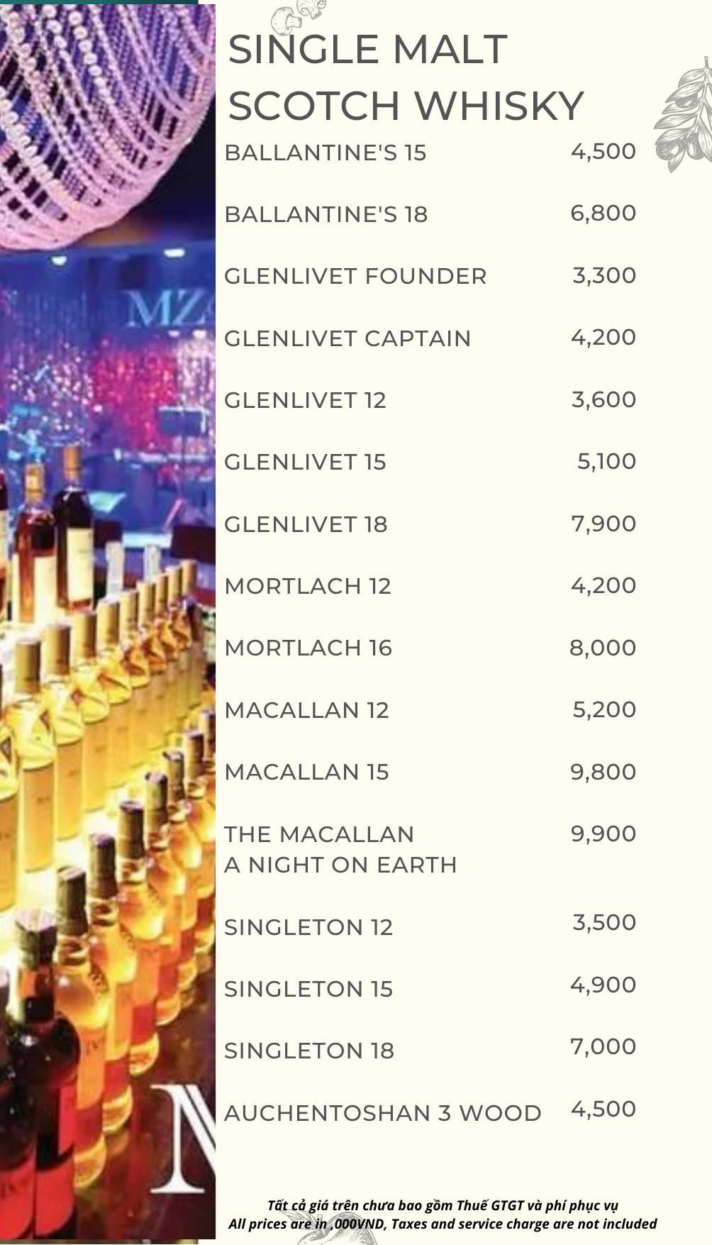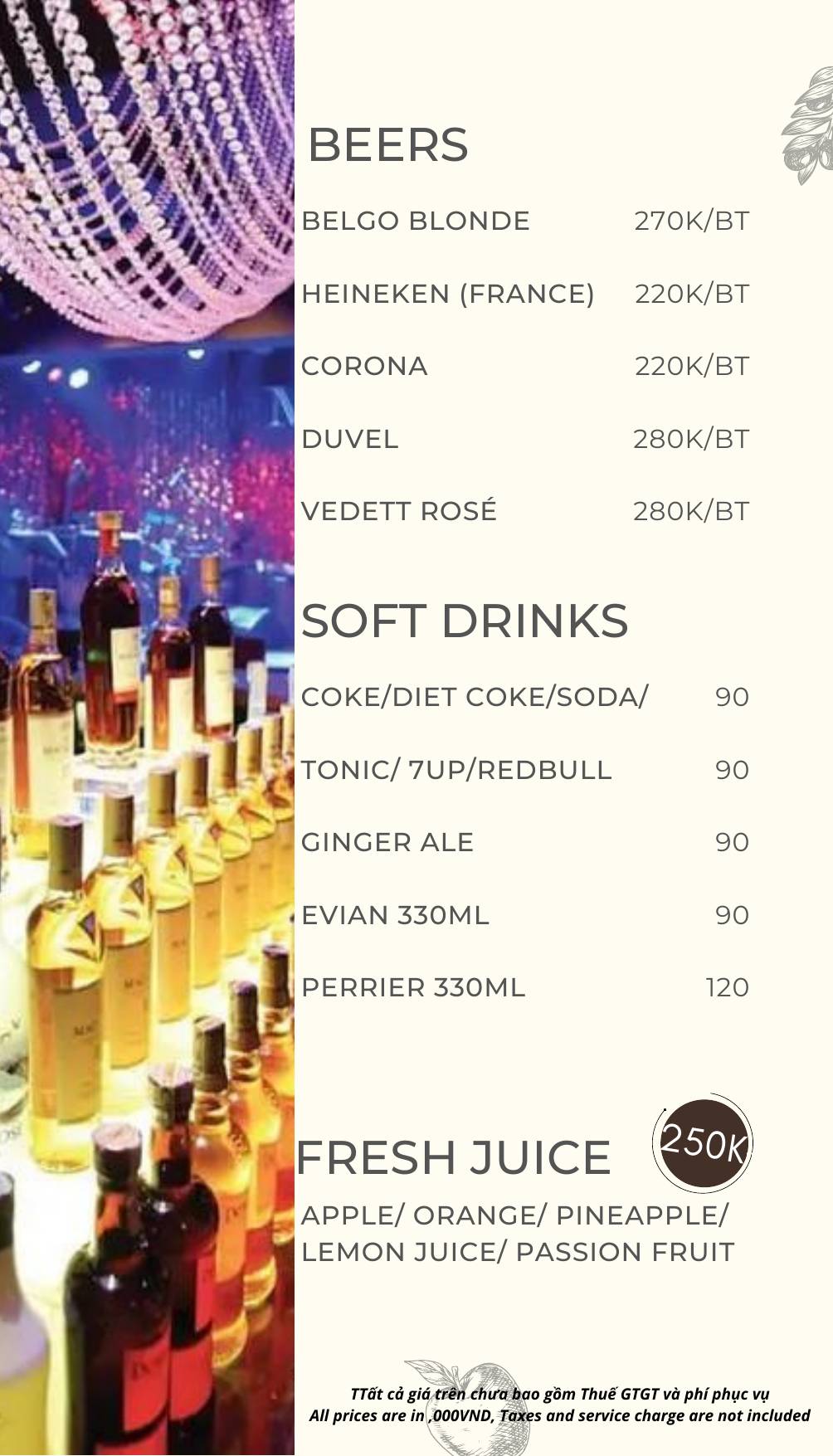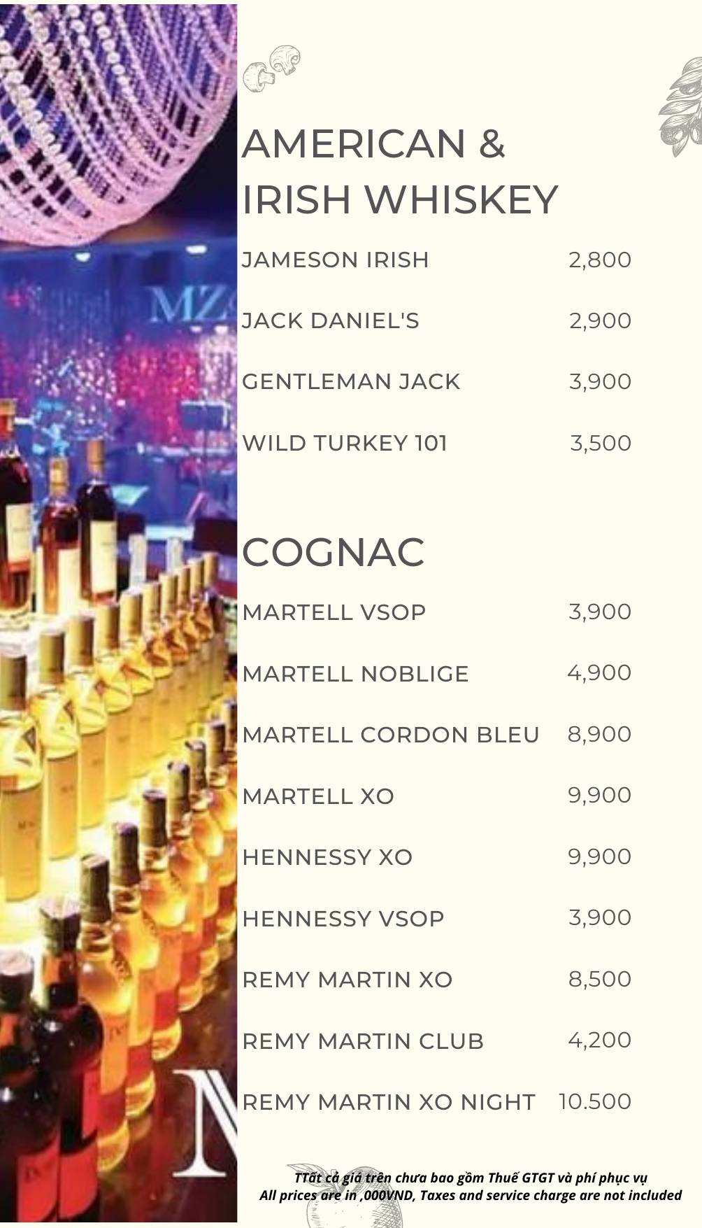 MZ Club phục vụ menu đồ uống phong phú, từ cocktail, rượu mạnh đến combo bàn cho nhóm.