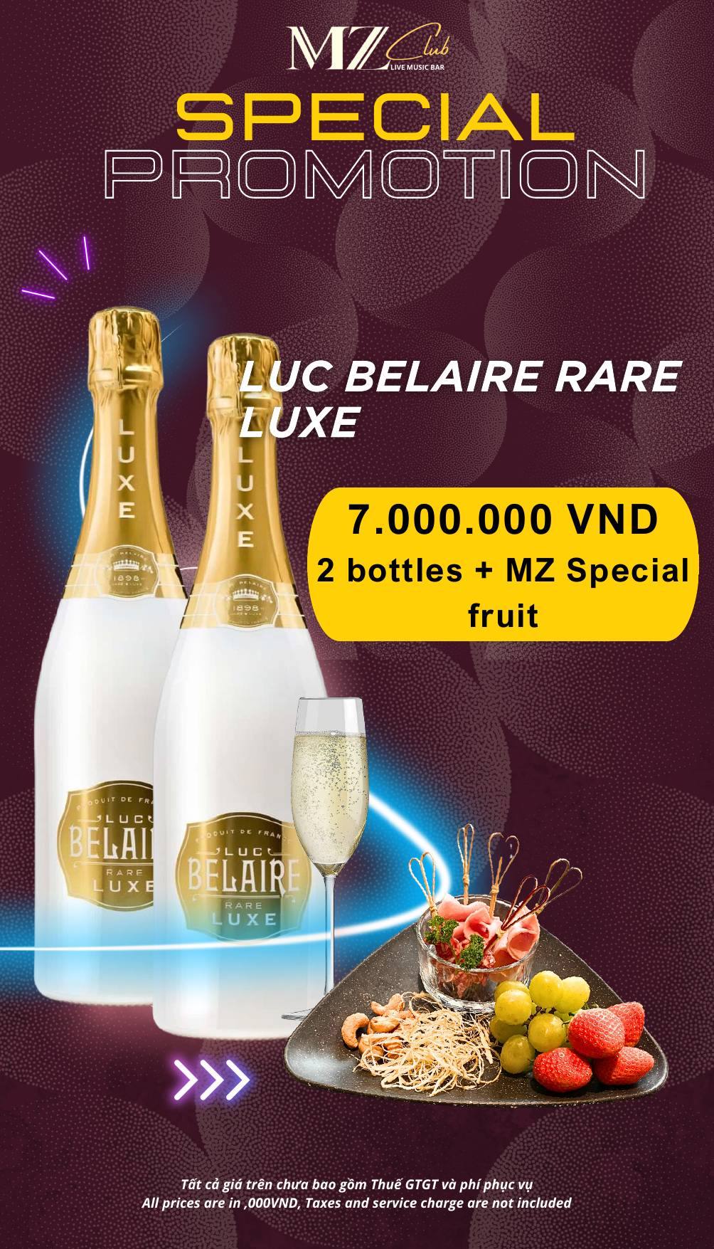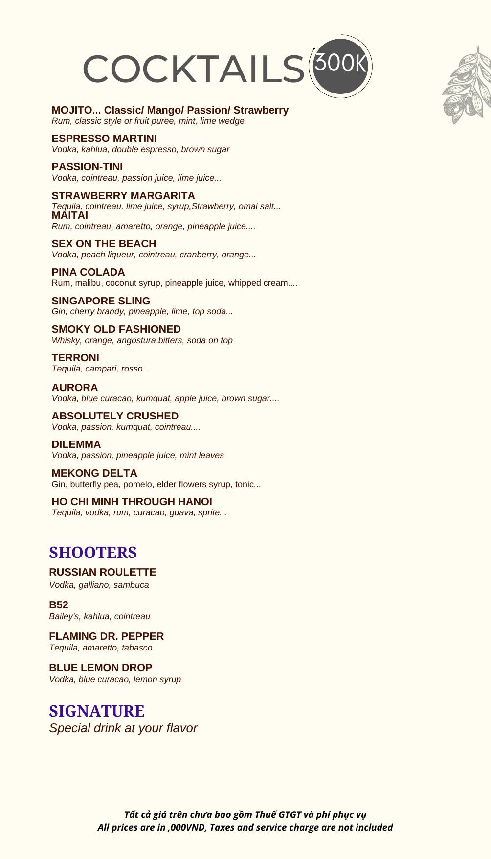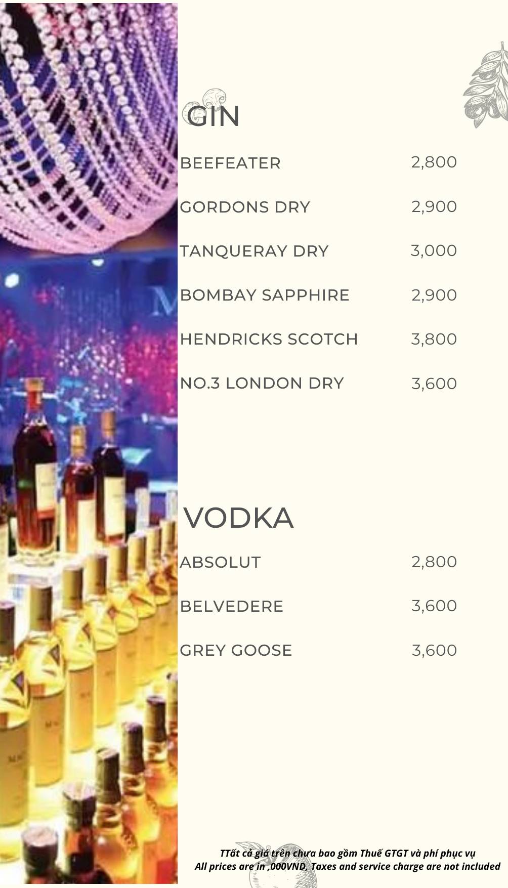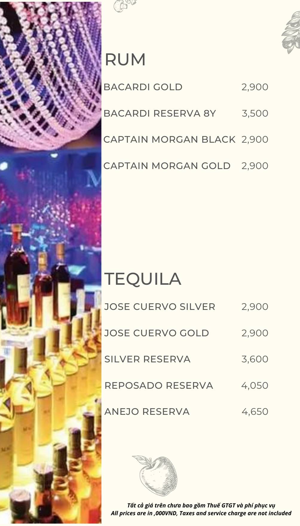 MZ Club phục vụ menu đồ uống phong phú, từ cocktail, rượu mạnh đến combo bàn cho nhóm.