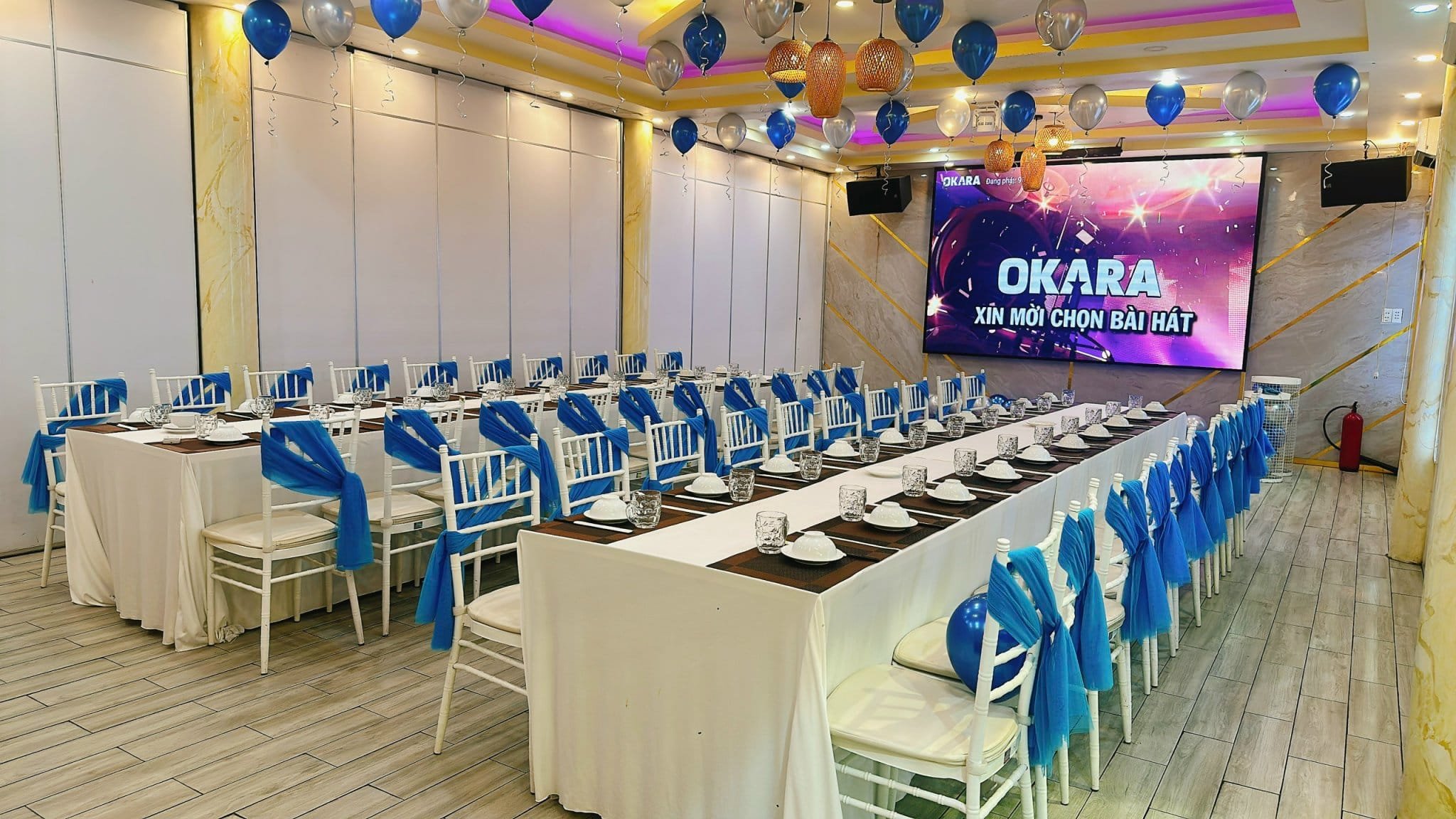 Phòng tiệc và sân vườn đều có màn hình led siêu to ,có thể chạy hình theo yêu cầu của khách